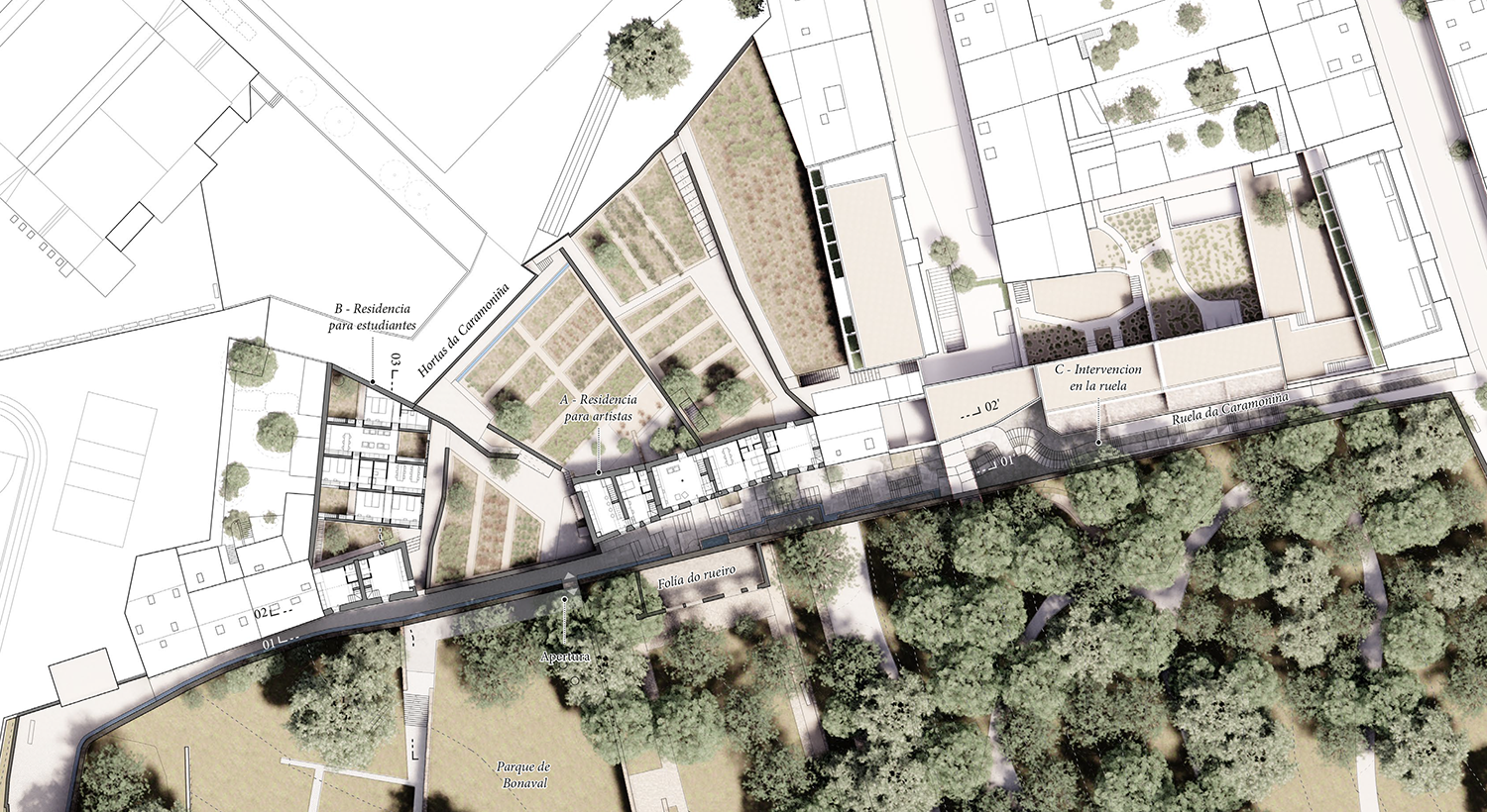 La rua de Caramonina se trouve au nord-est de la ville de Saint-Jacques de Compostelle, dans une enclave privilégiée où se côtoient des architectures de grande valeur historique et des interventions contemporaines de qualité reconnue comme le centre d’art contemporain d’Alvaro Siza. La problématique du site se décline en quatre thèmes principaux : l’accessibilité de la ruelle abrupte, sa connexion avec le parc voisin, la réhabilitation des maisons traditionnelles en ruine et la construction d’un nouveau bâtiment dans la zone horticole.